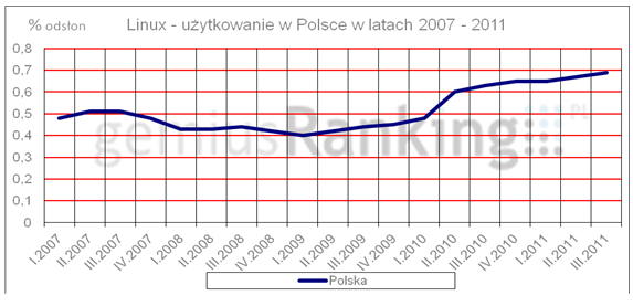 2011 r. także obserwujemy wzrost udziału odsłon dokonywanych przez użytkowników Linuksa w całkowitej liczbie odsłon.