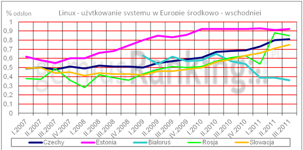 0,9 proc. wszystkich odsłon w sieci jest generowanych przez użytkowników Linuksa. Doganiają ją takie kraje jak Rosja, Czechy czy Słowacja z wynikami odpowiednio  na poziomie 0,81 proc., 0,85 proc. i 0,75 proc. Natomiast w Białorusi, w bieżącym roku  odsetek odsłon wykonanych w internecie przez użytkowników Linuksa wyniósł 0,4 proc. Co stanowi ponad 30 proc. spadek w stosunku do 2010 r.