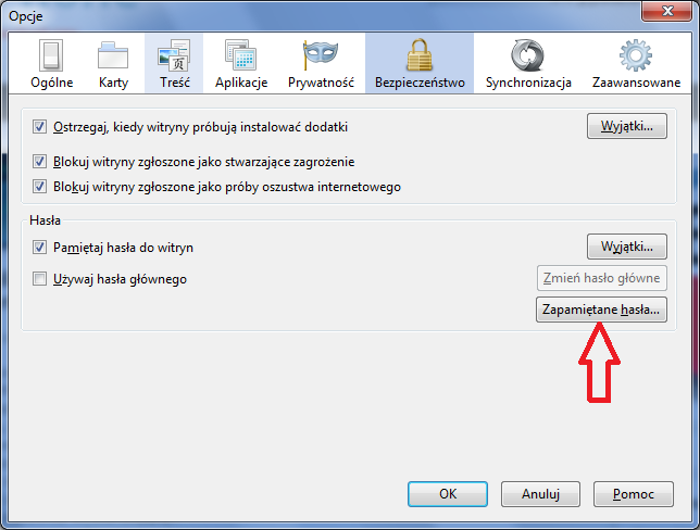 Wchodzimy w przeglądarce na Opcje. Wybieramy zakładkę Bezpieczeństwo i w sekcji Hasła klikamy na Zapamiętane hasła. Otworzy nam się okno, w którym będą pokazane witryny i nazwy użytkowników. Klikamy na przycisk Wyświetl hasła i zatwierdzamy Tak. W tym momencie pokażą nam się wszystkie hasła zapamiętane przez przeglądarkę.