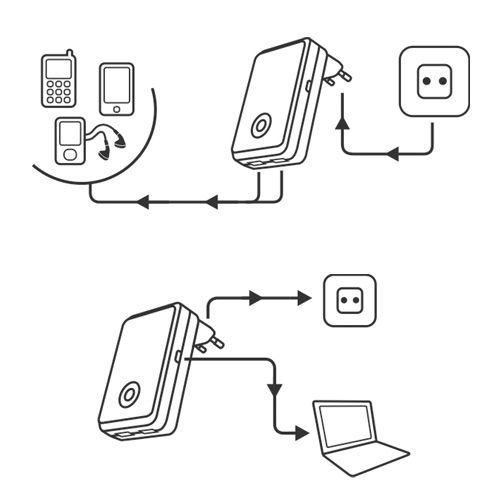 Kiedy zaś użytkownik będzie miał dostęp do gniazdka elektrycznego, wystarczy rozwinąć wbudowaną wtyczkę i podłączyć do standardowego źródła energii. Takie rozwiązanie sprawia, że urządzenie posłuży nam jako tradycyjna ładowarka wszelkich urządzeń zasilanych napięciem 5V takich jak: smartfon, odtwarzacz mp3, tablet itp.