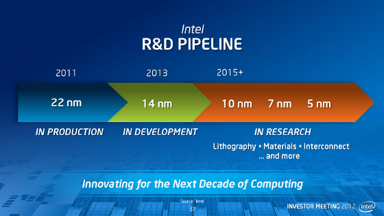W planach Intela na najbliższy okres są intensywne prace nad opracowaniem kolejnego wymiaru technologicznego, tym niższym szczebelkiem będzie 14 nm. Jeśli wszystko przebiegnie zgodnie z planem powinno zakończyć się w 2013 roku, zaś pierwsze urządzenia wykonane w 14 nm powinny wyjechać z fabryk w 2014 roku.