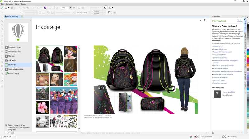 - Nowe narzędzia edukacyjne: Szybkie rozpoczęcie pracy w przyjaznym środowisku, które zapewnia możliwości łatwej konfiguracji, zasoby edukacyjne dostępne z poziomu produktu oraz ulepszone okno dokowane. Sprawdzanie nowości w obszernym przewodniku dla początkujących lub korzystanie ze specjalnego przewodnika po produkcie dla zaawansowanych użytkowników poprzednich wersji programów CorelDRAW, Corel® PHOTO-PAINT® oraz innych aplikacji do projektowania grafiki.