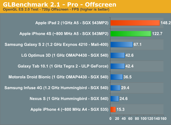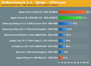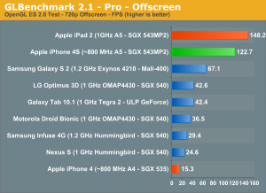 Redaktorzy AnandTech sprawdzili też wydajność poszczególnych produktów koncernu z Cupertino w dedykowanym iOS-owi benchmarku Geekbench. Przy okazji ujawnił on ciekawe dane dotyczące taktowania procesora A5 w iPhonie 4S. Ma on zegar o 200 MHz niższy niż iPad z procesorem 1 GHz. W związku z tym, jak łatwo się domyślić, w Geekbenchu to właśnie tablet Apple’a osiąga najlepsze wyniki. Również tu potwierdziło się, że dwa rdzenie w telefonie firmy Tima Cooka są około 40-50% szybsze niż starsza wersja jednordzeniowa.Wyższe taktowanie iPada daje mu przewagę w innym teście – GLBenchmark 2.1. Tablet uzyskał w nim o kilkanaście procent lepszy rezultat.