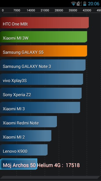 Jeśli chodzi o wydajność, urządzenie posiada układ Snapdragon 400, który nie należy do demonów szybkości, jednak muszę przyznać, że przy moim normalnym użytkowaniu nie natknąłem się na bardziej widoczne spowolnienia. W przypadku gier, na kilka testowanych (Real Boxing, Bike Racing 3D, Asphalt 8: Airborne), w żadnej z nich nie zauważyłem spowolnienia. Jeśli chodzi o normalne użytkowanie, tutaj urządzenie kilka razy potrafiło na moment się zawiesić, ale było to tak krótko, że na pewno nie nazwałbym tego problemem. Dla zainteresowanych wynikami benchmarków (AnTuTu, Quadrant), przedstawiam kilka z nich: