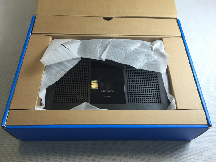 Urządzenie wygląda dość standardowo – prostokątna bryła wykonana z czarnych plastików. Górna część niemal w całości została pokryta siatką otworów wentylacyjnych. Na środku umieszczono wstawkę wykonaną z błyszczącego plastiku, na którym umieszczono logo LINKSYS, a pod nim oznaczenie modelu.